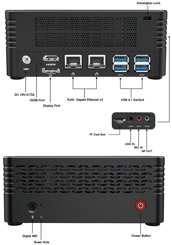 Оснащение неттопа включает беспроводной модуль Intel AX200 с поддержкой Wi-Fi 6/Bluetooth 5.1, два гигабитных сетевых интерфейса и кардридер MicroSD. Владельцам также доступны четыре порта USB 3.2 Gen2, набор 3,5-мм аудиоразъёмов, видеовыходы HDMI и DisplayPort. Для питания устройства используется внешний адаптер номиналом 90 Вт.
