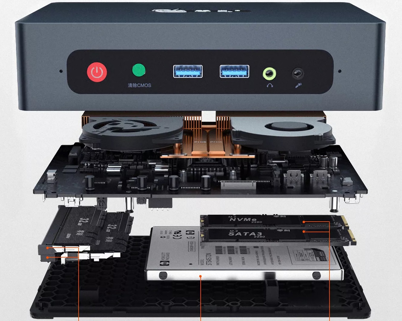 Базовая конфигурация Beelink LZX включает 8 Гбайт оперативной памяти DDR4 (расширяется до 64 Гбайт), NVMe-накопитель вместимостью 256 Гбайт и терабайтный жёсткий диск формата 2,5 дюйма. Предусмотрен второй слот M.2 для SSD с интерфейсом SATA 6 Гбит/с. Оснащение мини-ПК также представлено шестью портами USB 3.2 Gen1, двумя гигабитными Ethernet, беспроводным модулем Wi-FI 5, парой 3,5-мм аудиоразъёмов и двумя видеовыходами HDMI 2.0.