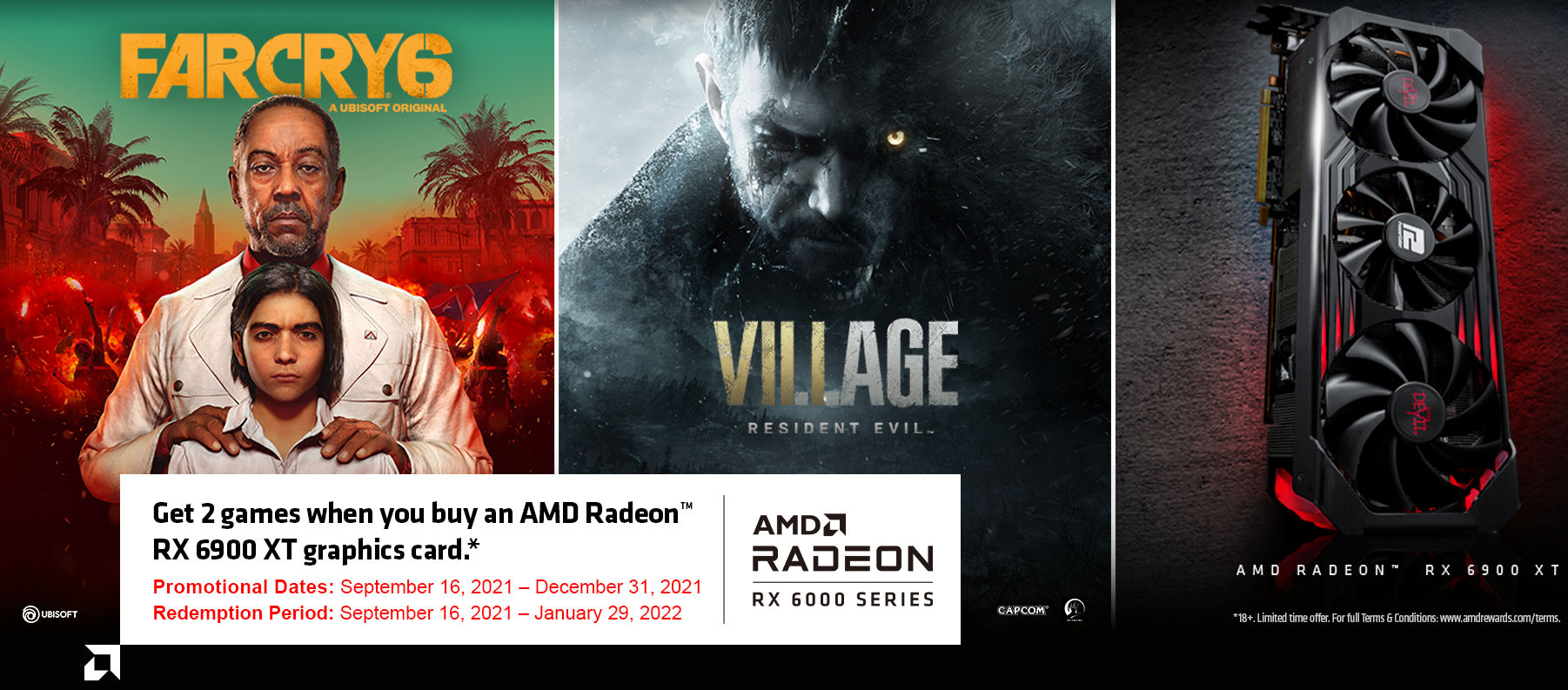 На прошлой неделе AMD запустила обновлённую программу лояльности Raise the Game, принявшись раздавать ключи к Far Cry 6 и Resident Evil Village. Изначально она распространялась только на игровые компьютеры и ноутбуки, использующие связку процессоров Ryzen 3000/5000 и видеокарт Radeon RX 6000-й серии. Теперь упомянутые игры можно будет получить в придачу к топовому 3D-ускорителю Radeon RX 6900 XT.