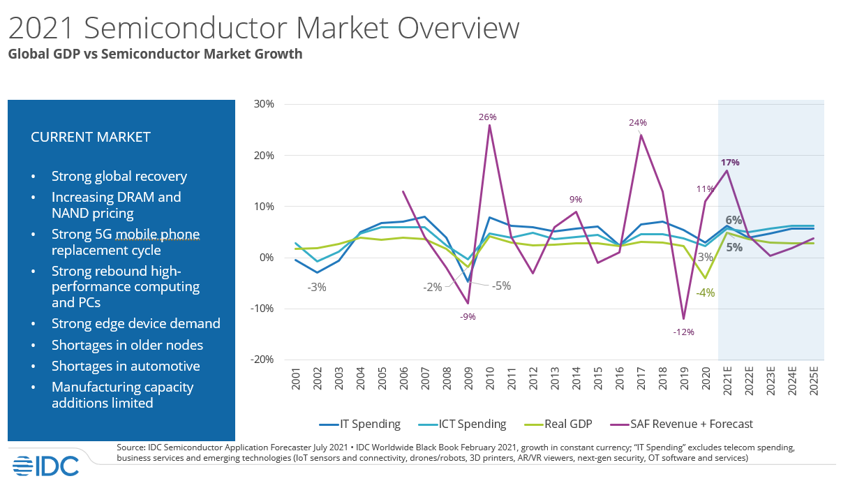 В целом IDC ожидает, что к 2025 году объём мирового рынка полупроводников достигнет 600 миллиардов долларов со среднегодовым темпом роста на уровне 5,3%. Эксперты также не исключают возникновения перепроизводства в 2023 году, когда вендоры закончат строительство заводов, начатое в период 2020-2022 годов.