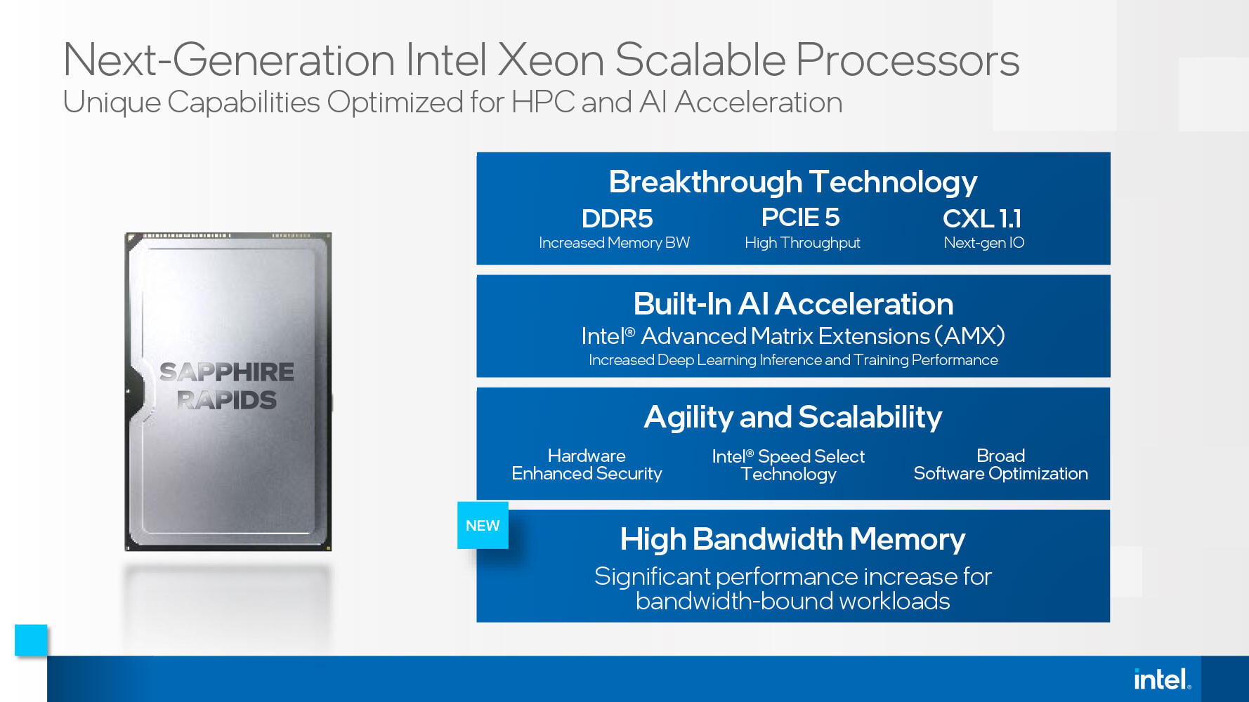 С выпуском процессоров Xeon Scalable 4-го поколения (Sapphire Rapids) Intel обеспечит поддержку множества новых инструкций и специальных алгоритмов ускорения, предназначенных для новых рабочих нагрузок.