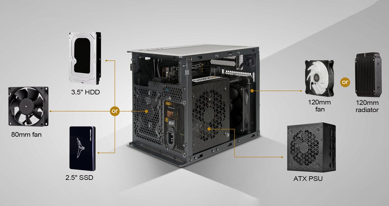 Корпус SilverStone Sugo 16 вмещает двухслотовую видеокарту длиной до 275 мм, ATX-совместимый блок питания, пару 120-мм вентиляторов и радиаторов СЖО, а также по одному 2,5- и 3,5-дюймовому накопителю. Есть возможность установки CPU-кулера высотой до 172 мм, правда, для этого придётся использовать БП типоразмера SFX.