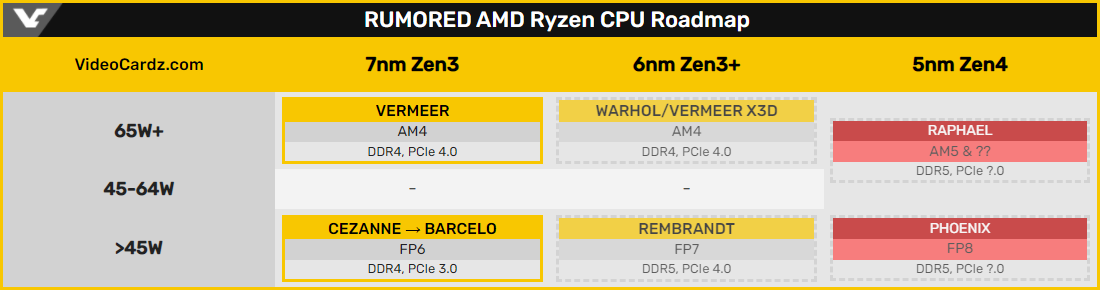 Если говорить о планах AMD на обозримое будущее, то этой зимой состоится дебют мобильных процессоров Ryzen 6000 из семейств Rembrandt и Barcelo. Первые APU сочетают x86-ядра на архитектуре Zen 3+ и графический блок RDNA 2, а вторые, грубо говоря, являются «рефрешем» актуальных процессоров AMD Cezanne.