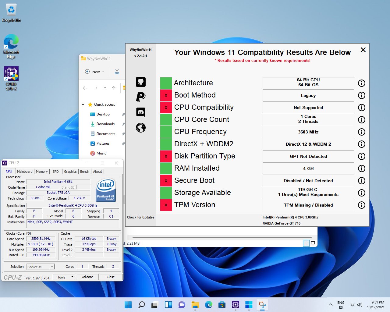 Если верить скриншоту, в системе было установлено 4 ГБ оперативной памяти и видеокарта GeForce GT 710. Официальная утилита Microsoft определила отсутствие поддержки Secure Boot и TPM 2.0, хотя Windows 11 удалось загрузить как минимум до рабочего стола и выполнить базовые действия.