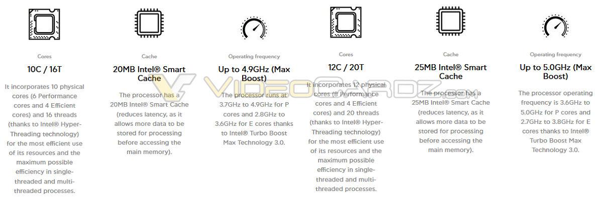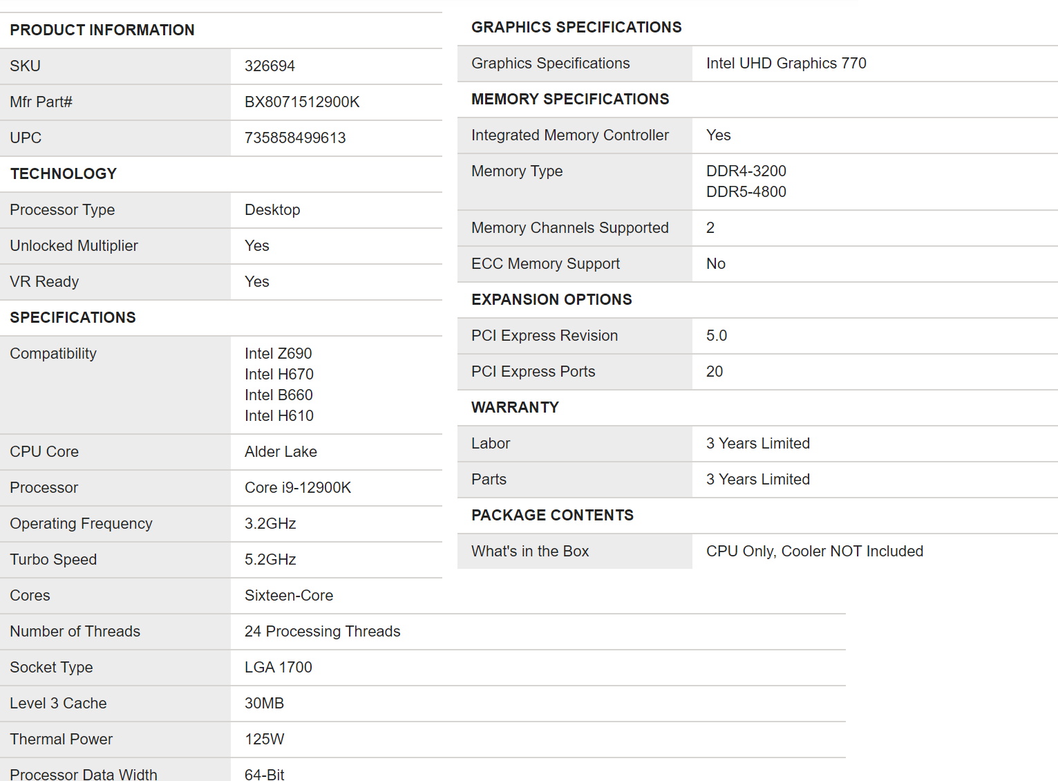 Также MicroCenter подтвердил технические характеристики обоих чипов, хотя без уточнений по большим и малым ядрам. Максимальная частота в 5,2 ГГц для Core i9-12900K очевидно относится к динамическому разгону для одного ядра Golden Cove в режиме Thermal Velocity Boost.