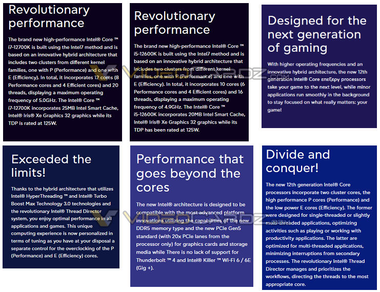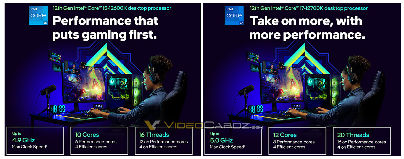 Кроме того, портал Videocardz продолжает делиться маркетинговыми материалами Intel. Новые данные подтверждают технические характеристики Core i7-12700K и Core i5-12600K. В материалах объясняется, что CPU с индексом K идеально подходят для игр и предлагают новые функции разгона для обоих типов гибридных ядер вместе или по отдельности.