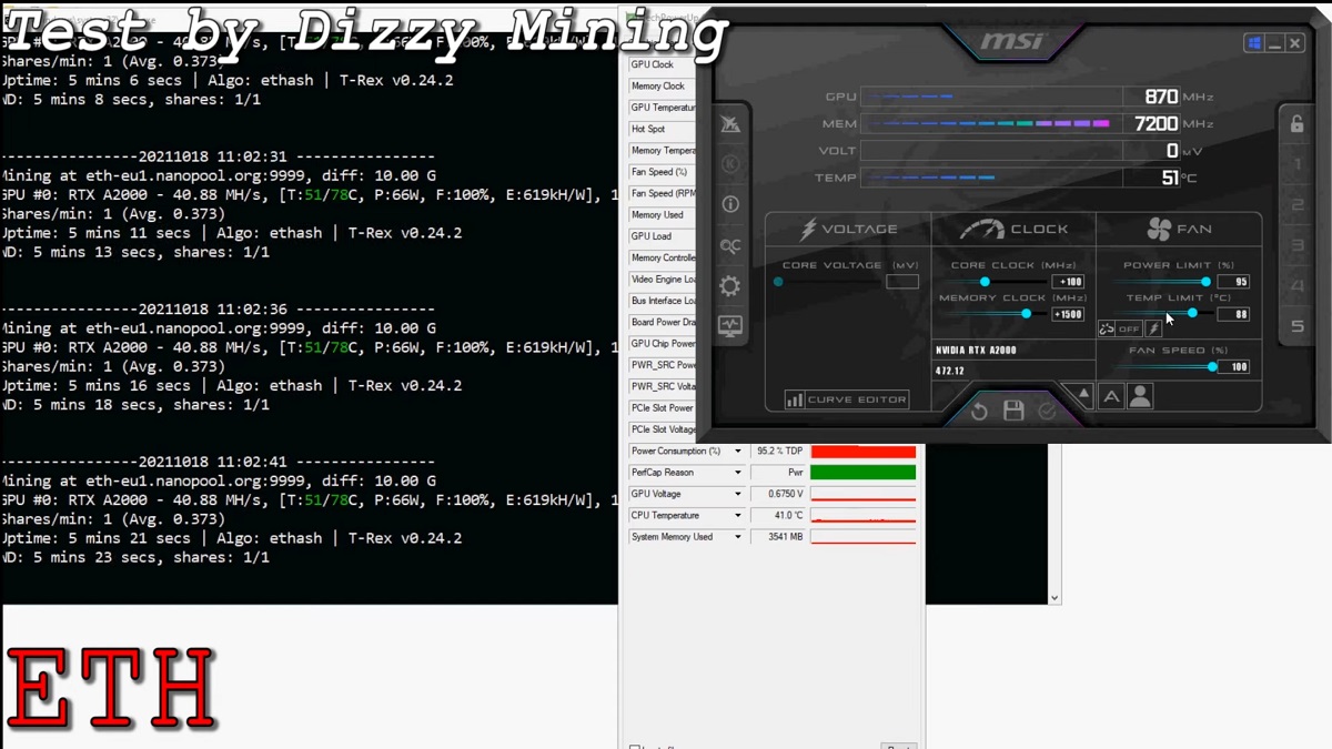В штатном режиме Nvidia RTX A2000 добывает Ethereum на скорости 32-33 MH/s. Если прибегнуть к оверклокингу, разогнав память GDDR6 до 14,4 ГГц (эффективных), этот показатель можно увеличить до 41 MH/s. Что важно, энергопотребление видеокарты в таком режиме удаётся ограничить 66 Вт. Все манипуляции проводились через утилиту MSI Afterburner, которая не так давно научилась разгонять профессиональные карты Nvidia RTX Ampere