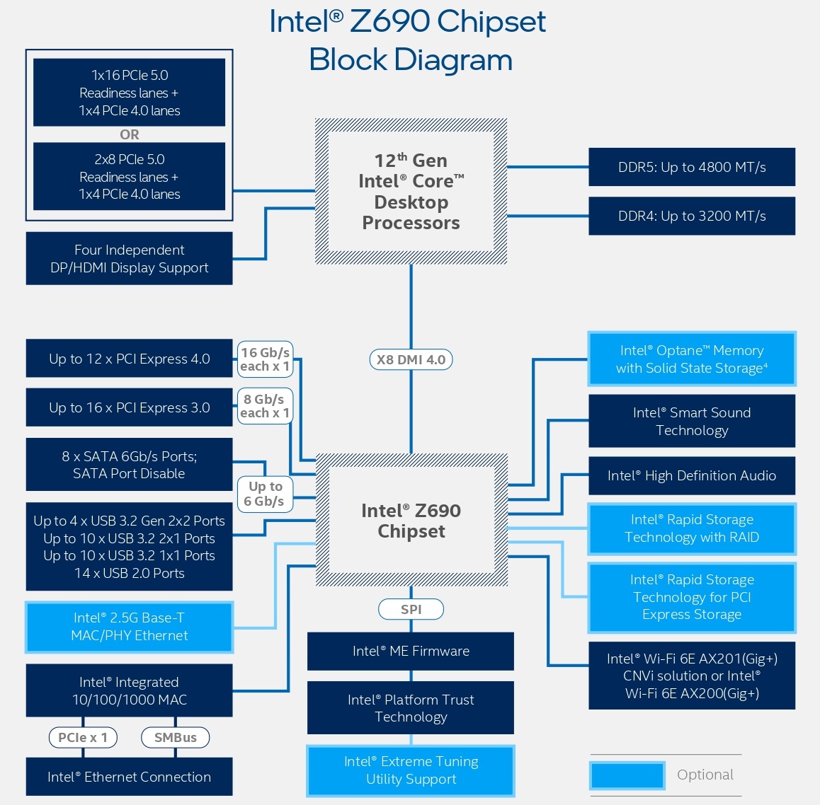 Использовать новые процессоры можно в связке с платами LGA1700 на чипсетах Intel 600-й серии, правда, сейчас был анонсирован только Z690. Этот набор логики предоставит весь набор инструментов, необходимых для разгона Alder Lake-S, а также обеспечит работу множества интерфейсов и портов, например, до 12 линий PCI Express 4.0 и 16 линий PCI-E 3.0. Блок-схема платформы LGA1700/Z690 доступна ниже.