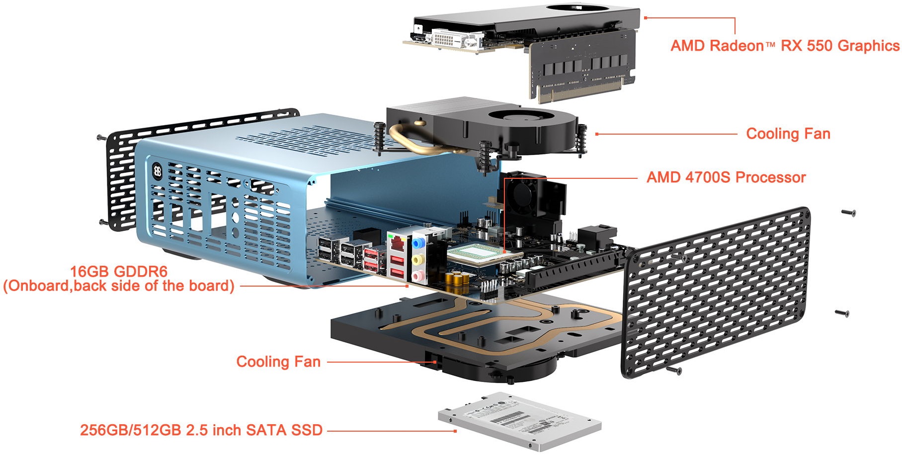 Minisforum EliteMini CR50 выполнен в корпусе с габаритами 205(Д) x 192(Ш) x 86(В) мм. Его оснащение включает 16 Гбайт оперативной памяти GDDR6, 2,5-дюймовый твердотельный накопитель вместимостью 256 или 512 Гбайт и видеокарту Radeon RX 550. Для питания новинки используется внешний адаптер.
