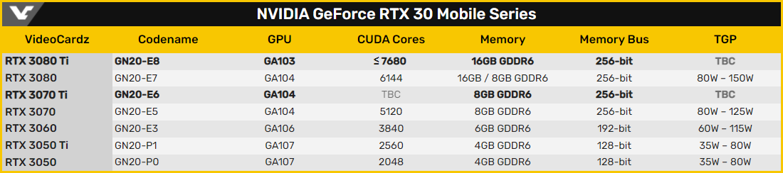 Относительно конфигурации GPU GA104 в составе мобильной GeForce RTX 3070 Ti на текущий момент никаких сведений не поступало. Впрочем, число ядер CUDA в распоряжении новинки будет находиться между GeForce RTX 3070 и RTX 3080, т.е. составит от 5120 до 6144 штук. Видеобуфер устройства представлен восемью гигабайтами GDDR6 с 256-разрядным интерфейсом.