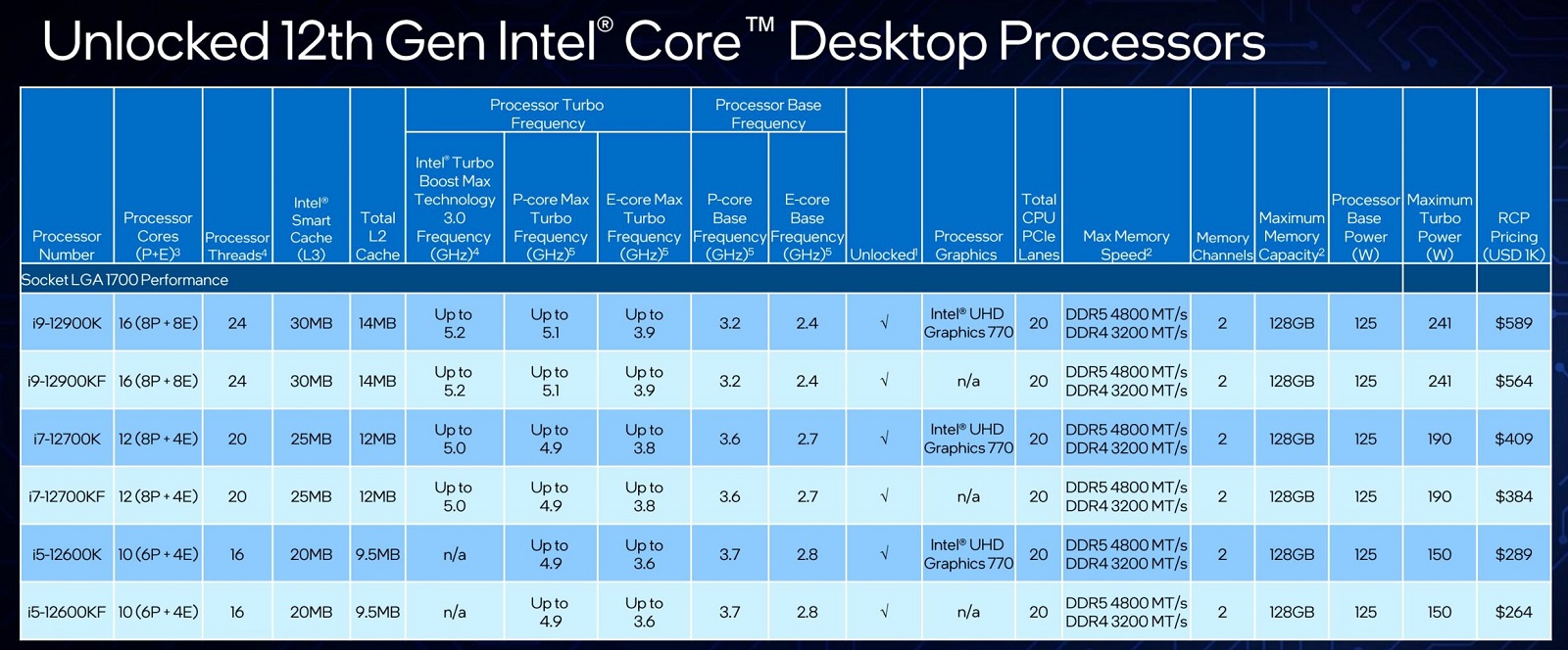 Изначально покупателям будут доступны процессоры Core i5-12600K, Core i7-12700K и Core i9-12900K, а также модели с суффиксом «F» и деактивированным видеоядром. Характеристики и рекомендованные цены новинок доступны в таблице. В случае украинской розницы за перечисленные CPU придётся выложить около 10 339 грн, 14 999 грн и 21 299 гривен соответственно.