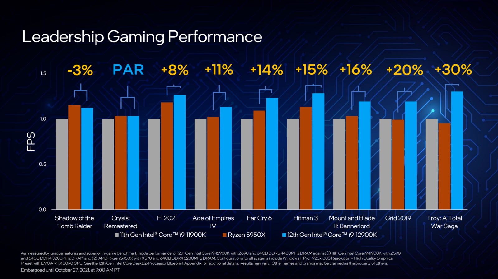 Вместе с началом продаж первых CPU Alder Lake-S спал запрет на публикацию обзоров. Наши постоянные читатели уже имеют представление о быстродействии новинок благодаря многочисленным утечкам и фальстартам. Если вкратце, то Intel всё-таки удалось вернуть лидерство в игровых бенчмарках, правда, за это чипы Core 12-го поколения расплачиваются высоким (на фоне конкурентов) энергопотреблением.