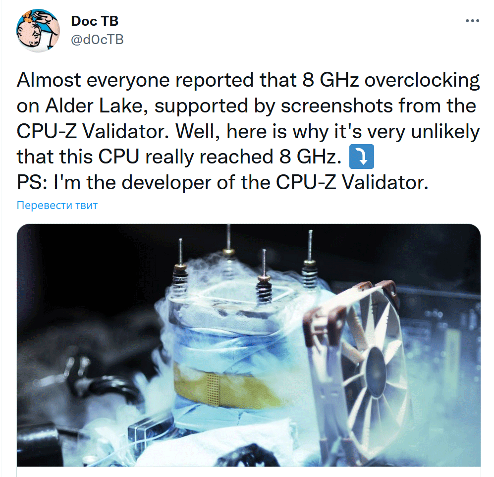 Однако разработчик CPU-Z, известный под именем Doc TB, опровергает полученные данные. По его словам, команда CPU-Z начала замечать фальшивые разгоны Alder Lake-S от 8 ГГц до 12 ГГц. В логических блоках CPU есть ошибки с коэффициентом, если он установлен выше 63.