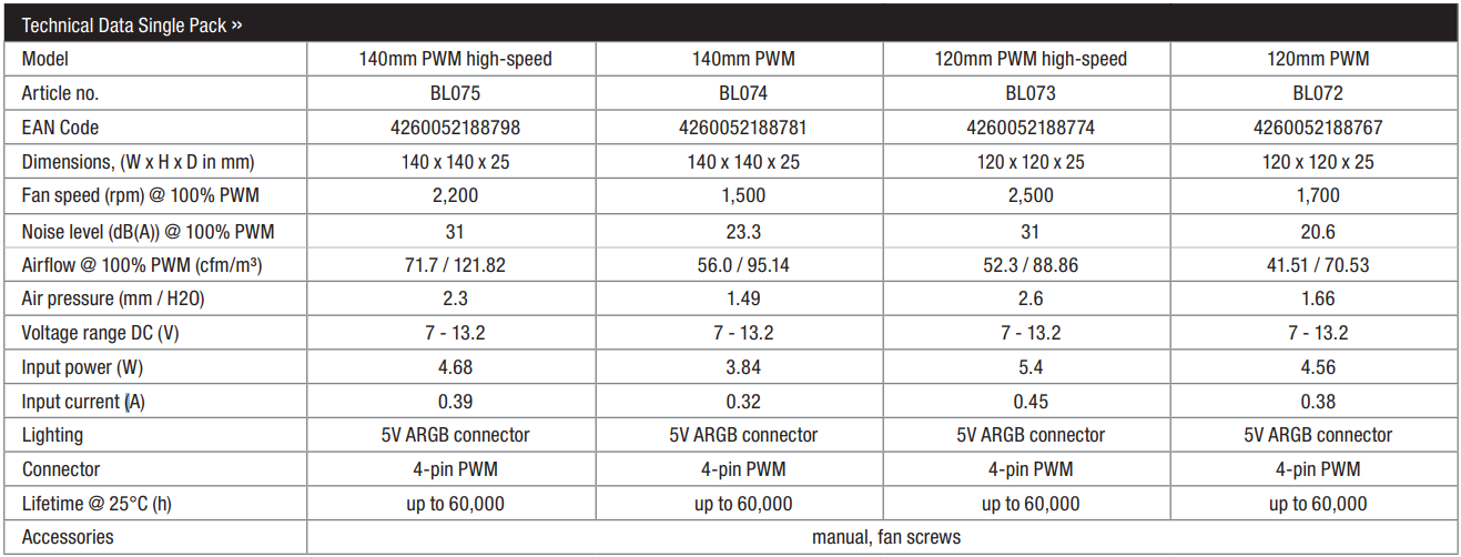 Вентиляторы be quiet! Light Wings доступны в версиях PWM и PWM high-speed, отличающихся максимальной скоростью вращения. Для 120-мм решений она соответственно равна 1700 и 2500 об/мин, 140-мм «вертушки» разгоняются до 1500 и 2200 об/мин. Во всех случаях поддерживается ШИМ-управление скоростью. Детальные характеристики новинок приведены в таблице.