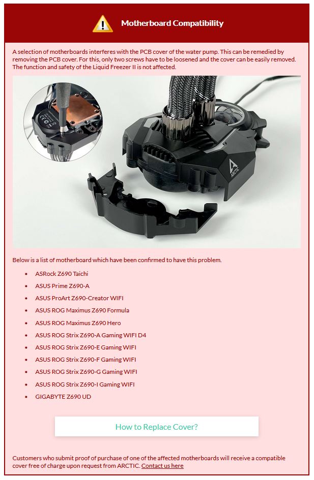 Тем временем Arctic предупреждает, что водоблок готовых СЖО Freezer II несовместим с некоторыми платами ASRock, ASUS и Gigabyte с логикой Z690. К счастью, производитель уже нашёл решение этого изъяна. Владельцам систем жидкостного охлаждения Arctic Freezer II следует демонтировать пластиковую деталь на водоблоке, после чего с его установкой не возникнет проблем.