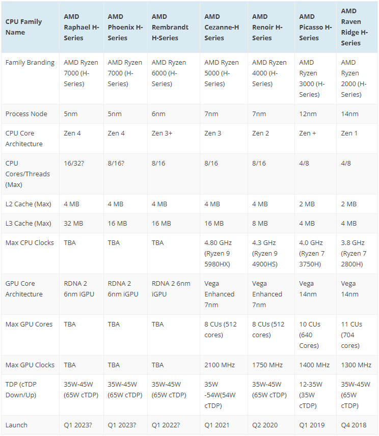 Гибридные чипы AMD Phoenix-H получат до восьми ядер Zen 4 с поддержкой технологии SMT, а их уровень TDP составит менее 40 Вт. В то же время процессоры Raphael-H смогут предложить вплоть до 16 ядер Zen 4 с SMT, однако их теплопакет выйдет за рамки 45 Вт. Оба семейства процессоров будут выпускаться по 5-нм технологии и дебютируют в первом квартале 2023-го. Для удобства в таблице ниже собраны все известные характеристики будущих APU.
