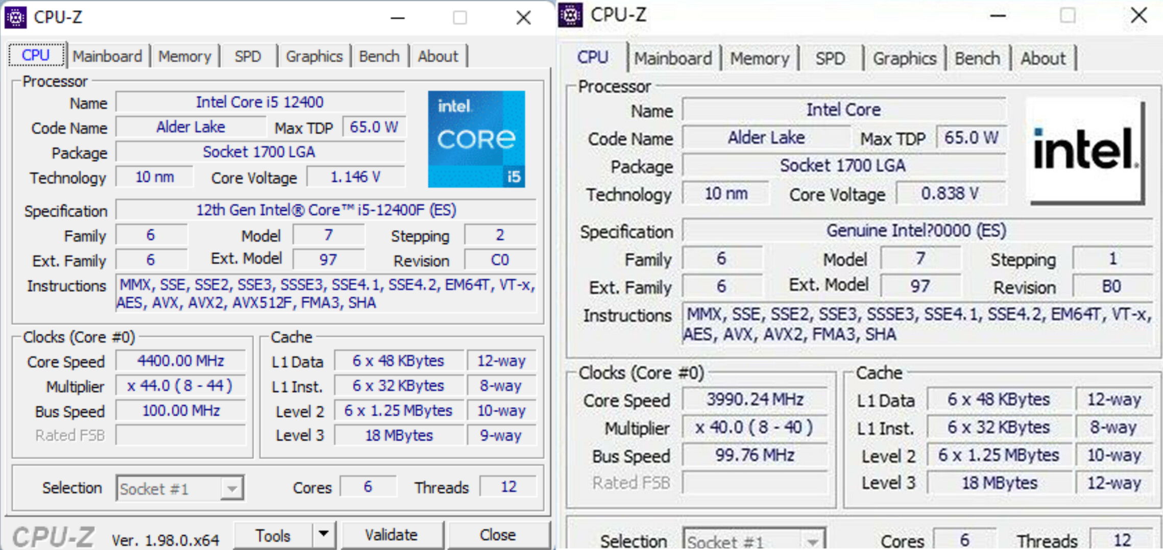 Спецификации розничного (слева) и инженерного варианта Core i5-12400