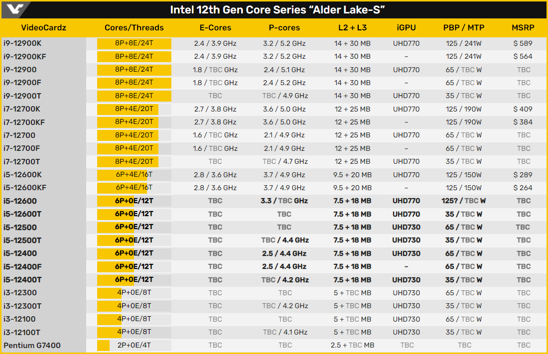 В розницу процессоры Intel Core 12-го поколения с заблокированным множителем поступят в начале следующего года. С предварительными характеристиками будущих CPU Alder Lake-S можно ознакомиться в таблице.