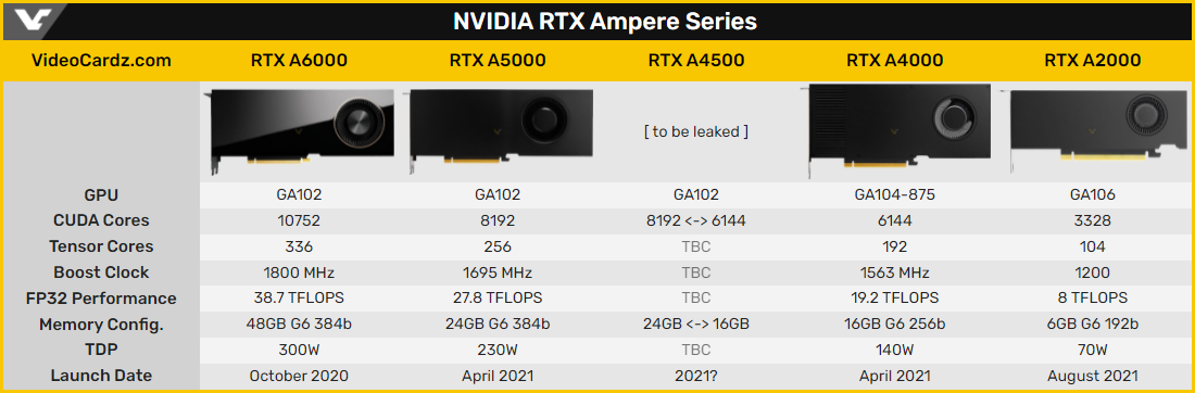 Линейка профессиональных 3D-ускорителей Nvidia RTX в скором времени пополнится моделью RTX A4500 на базе графического процессора GA102. О подготовке устройства стало известно из онлайн-базы Евразийской экономической комиссии (ЕЭК). Новинку также упоминают разработчики утилиты AIDA64 в описании бета-версии приложения вместе с мобильной GeForce RTX 3080 Ti на ядре GA103.