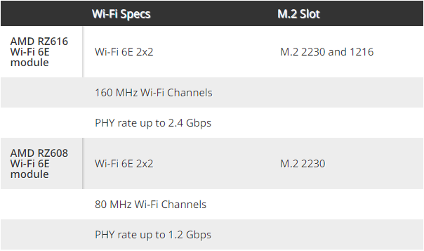 Беспроводной адаптер AMD RZ616 выполнен в виде карты модуля M.2 типоразмера 2230 или 1216 и обеспечивает пропускную способность до 2,4 Гбит/с при использовании канала 160 Мгц. В то же время AMD RZ608 имеет форм-фактор M.2 2230 и работает с 80-МГц каналами, обеспечивая скорость обмена информацией до 1,2 Гбит/с.