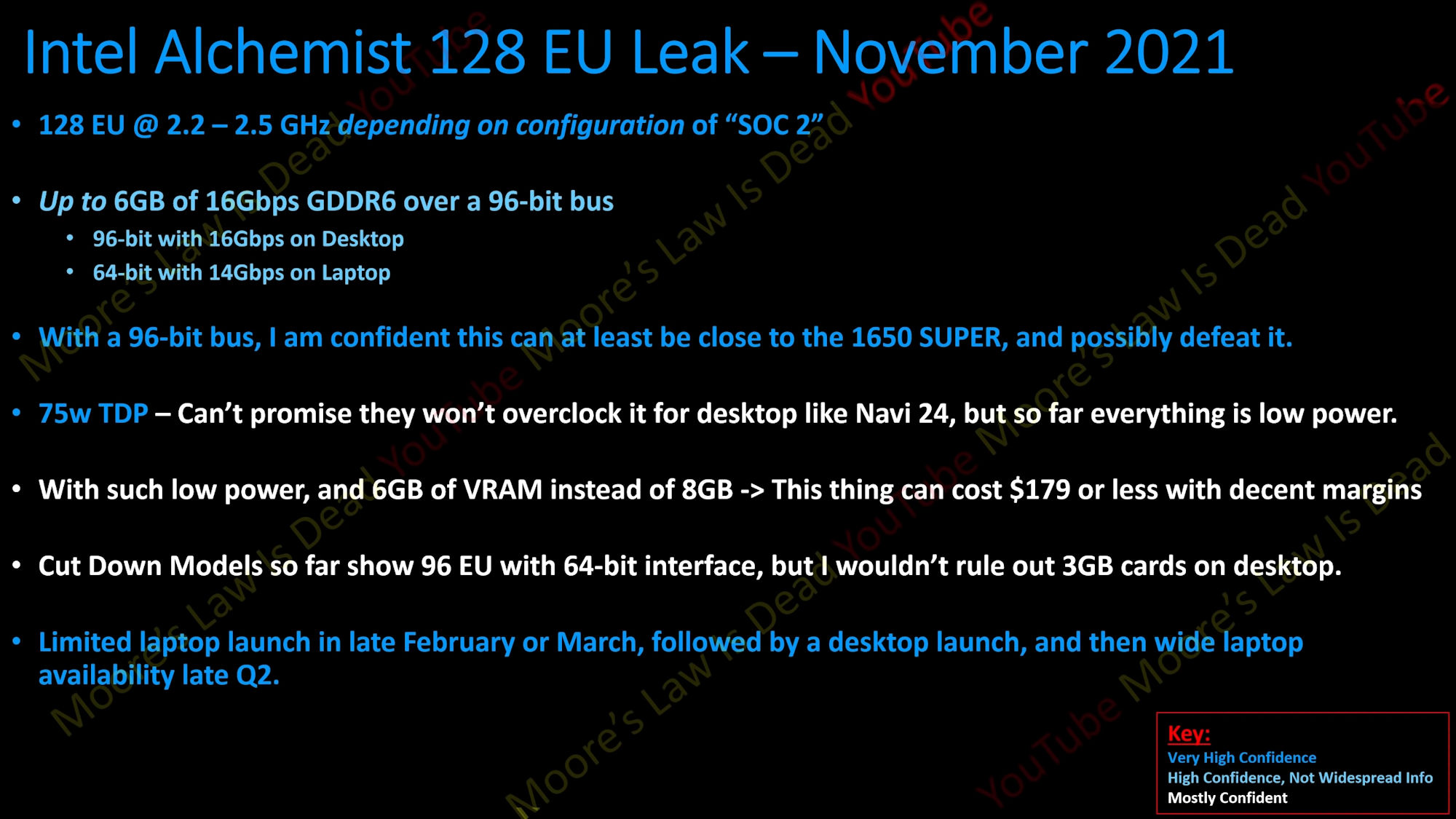 Видеоядро Intel DG2-128EU, как нетрудно понять из названия, оперирует 128 исполнительными блоками (Execution Units, EU) или 1024 вычислительными ядрами. Устройства на его основе получит до 6 Гбайт памяти GDDR6 с 96-битной шиной. Здесь речь идёт о десктопных модификациях, тогда как в ноутбуках будет использоваться 4-гигабайтный видеобуфер с 64-разрядным интерфейсом.