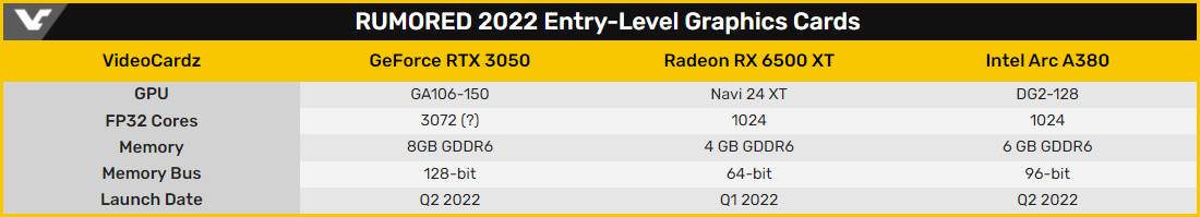 В начале 2022-го нас ждёт очередной виток борьбы производителей видеокарт за сердца и кошельки геймеров. Сразу три разработчика GPU намерены представить игровые 3D-ускорители начального уровня. AMD готовит карту Radeon RX 6500 XT, Nvidia наконец-то выпустит десктопный вариант GeForce RTX 3050, а Intel дебютирует с моделью Arc A380. Свежие утечки подтверждают характеристики новинок.