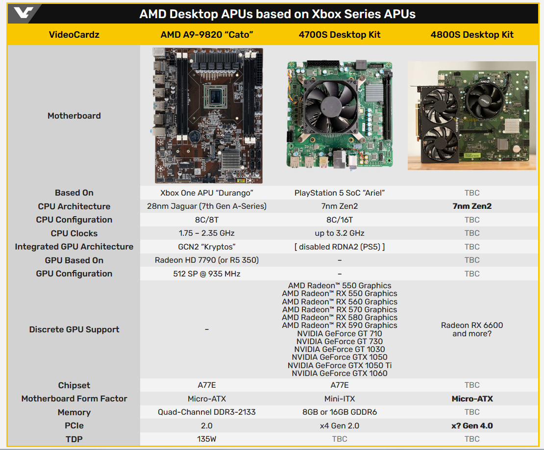 Портал Videocardz поделился первыми подробностями о 4800S Desktop Kit. Новый комплект имеет слот PCI-Express 4.0 для дискретных видеокарт, тогда как 4700S поддерживает только PCI-Express 2.0. Говорится, что в комплекте с 4800S Desktop Kit поставляется Radeon RX 6600.