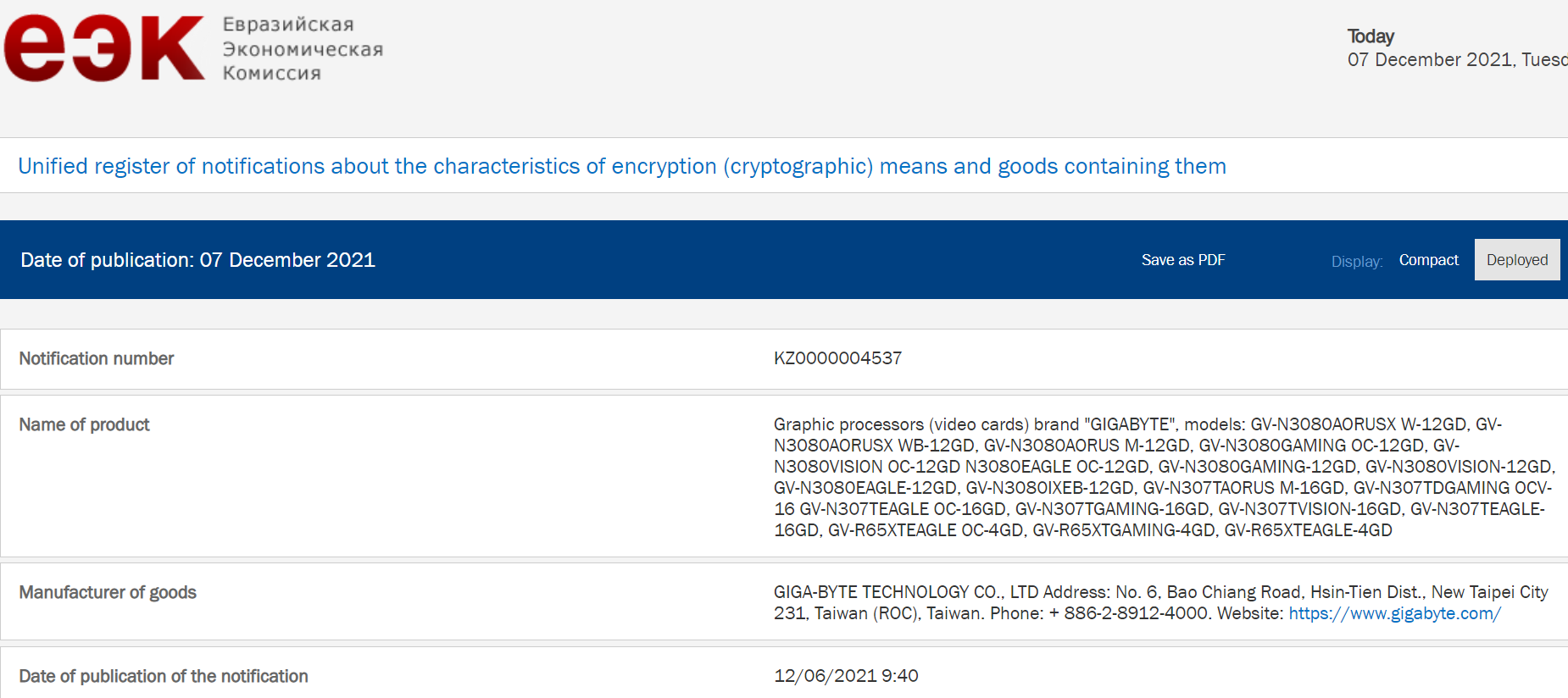 Gigabyte Technology ненароком раскрыла подготовку новых видеокарт на графических процессорах Nvidia и AMD. В базе данных ЕЭК (Евразийской экономической комиссии) тайваньский вендор зарегистрировал множество версий GeForce RTX 3080 12GB, RTX 3070 Ti 16GB, а также Radeon RX 6500 XT.