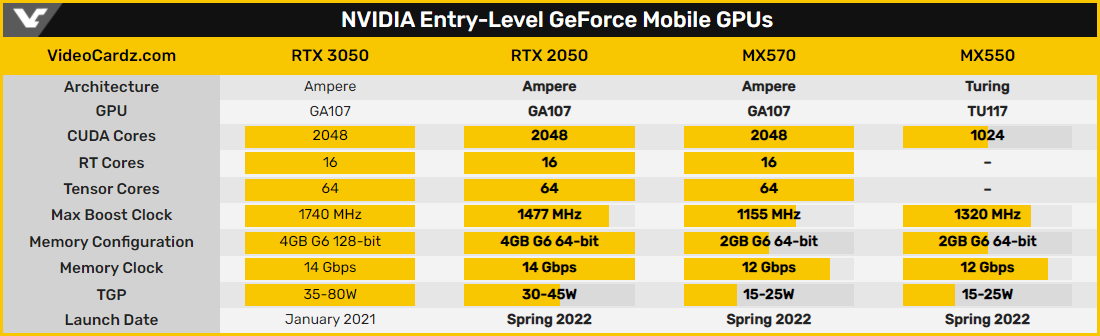 Главные отличия кроются в параметре Total Graphics Power (TGP) и объёме видеобуфера. Модель GeForce RTX 2050 получила 4 ГБ памяти GDDR6 и уровень TGP от 30 до 45 Вт, тогда как GeForce MX570 довольствуется 2 ГБ GDDR6 при номинальном TGP от 15 до 25 Вт. Частотные характеристики новинок приведены в таблице.