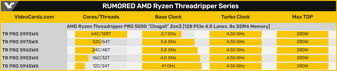 Модельный ряд процессоров AMD Ryzen Threadripper Pro 5000 (Chagall) представлен пятью решениями с числом ядер Zen 3 от 12 до 64 штук. Объём кэш-памяти L3 составляет от 64 до 256 Мбайт, а номинальный уровень TDP равен 280 Вт. Максимальная частота турборежима у всех моделей равна 4,55 ГГц.