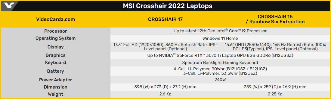 Детальные характеристики ноутбуков MSI Crosshair 15 и 17 будут объявлены в ходе выставки CES 2022. Сейчас известно, что в топовых конфигурациях используется 14-ядерный/20-поточный процессор Intel Core i9, модель с 15,6-дюйовым экраном получила IPS-матрицу с разрешением 2560 x 1440 точек и частотой обновления 165 Гц, а 17,3-дюймовый лэптоп оборудован IPS-панелью c разрешением 1920 x 1080 пикселей и частотой 360 Гц.