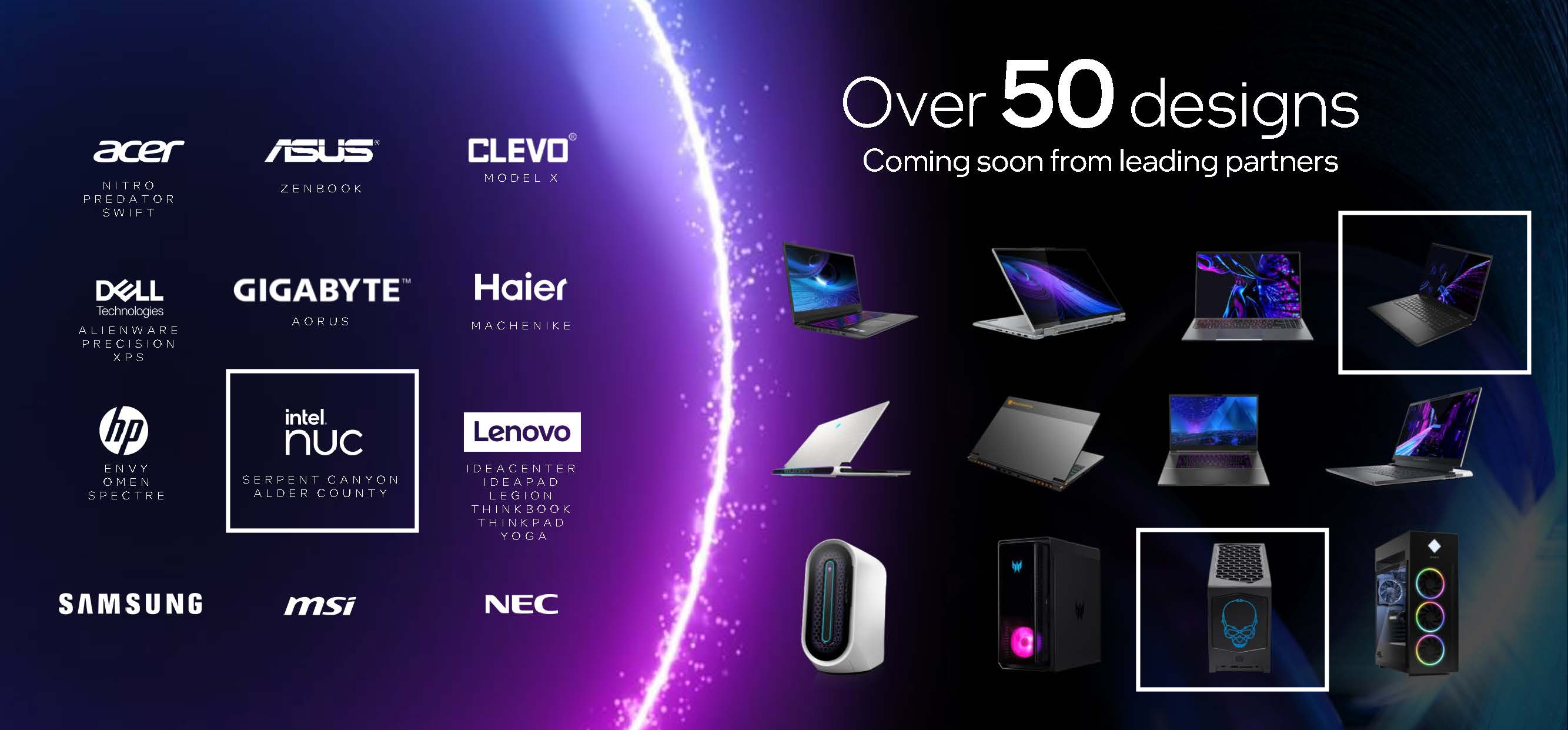 Alder County является преемником эталонного комплекта Intel для ноутбуков King County (NUC X15), который оснащался чипами Core i5-11400H/Core i7-11400H и графикой GeForce RTX 3060/3070. Дизайн King County использовался сторонними компаниями в своих продуктах, например, ADATA XPG Xenia.