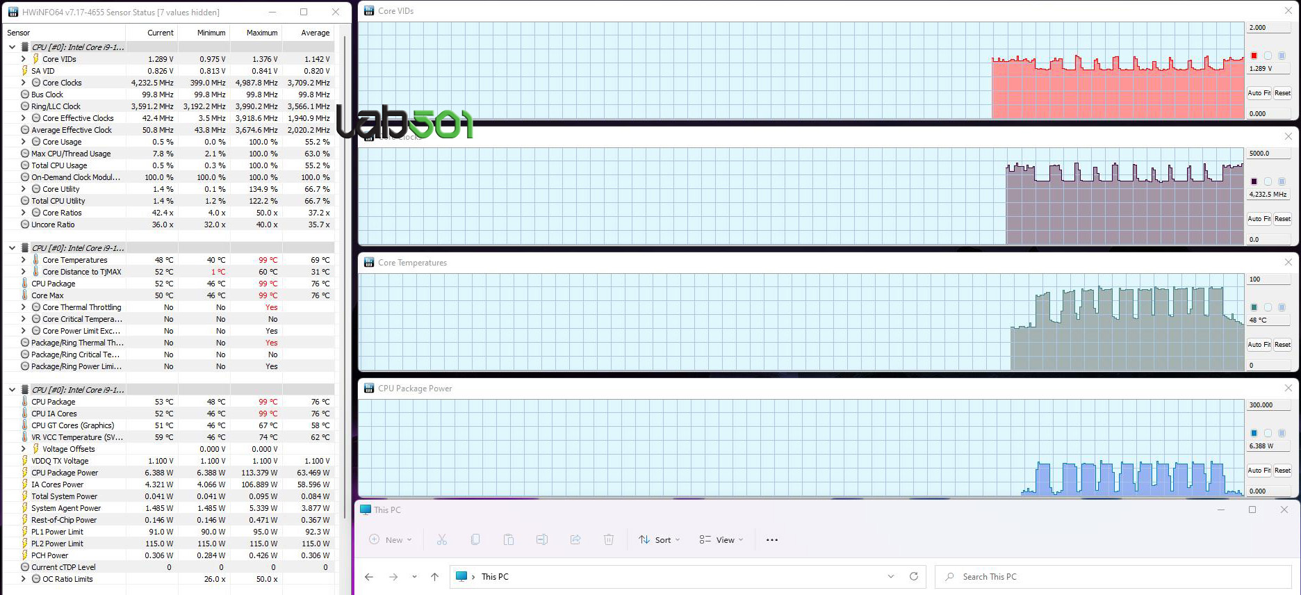 Во время стресс-теста Lab501 подтвердили, что P-core разгоняются до 4988 МГц с потреблением 113 Вт и максимальной температурой 99°C. При этом среднее потребление составило около 63 Вт, средняя температура процессора — 69°C, а CPU Package — 76°C.