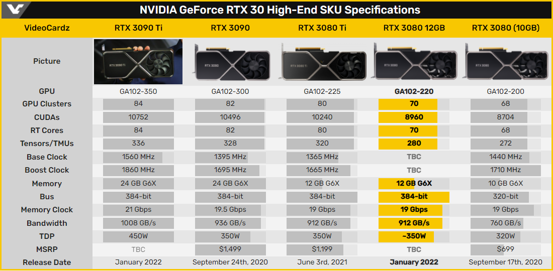 Согласно доступной информации, в GeForce RTX 3080 12GB будет использоваться GPU GA102 в конфигурации с 8960 ядрами CUDA, 280 тензорными, 70 RT-ядрами и 384-битным интерфейсом памяти. Видеобуфер представлен 12 гигабайтами GDDR6X с эффективной частотой 19 ГГц, что обеспечит пропускную способность на уровне 912 Гбайт/с. Штатный показатель TDP должен составить около 350 Вт.
