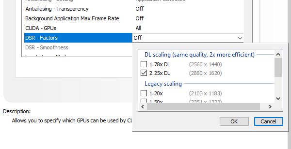 По сути, DLDSR представляет собой улучшенную версию метода сглаживания DSR (Dynamic Super Resolution), который уже многие годы доступен в Панели управления Nvidia. Обе технологии отвечают за рендеринг картинки в более высоком разрешении, которая затем масштабируется до разрешения экрана. Благодаря этому не только сглаживаются ступенчатые края объектов, но и повышается общая чёткость изображения.