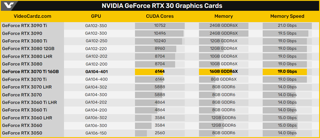 Обновлённая GeForce RTX 3070 Ti будет использовать тот же GPU GA104, что и выпущенная в прошлом году версия, а все нововведения сводятся к удвоенному объёму буфера GDDR6X. Изначально считалось, что Nvidia представит новинку вместе с GeForce RTX 3080 12GB. Однако по неизвестной причине «зелёные» решили не спешить с выпуском 16-гигабайтной GeForce RTX 3070 Ti.