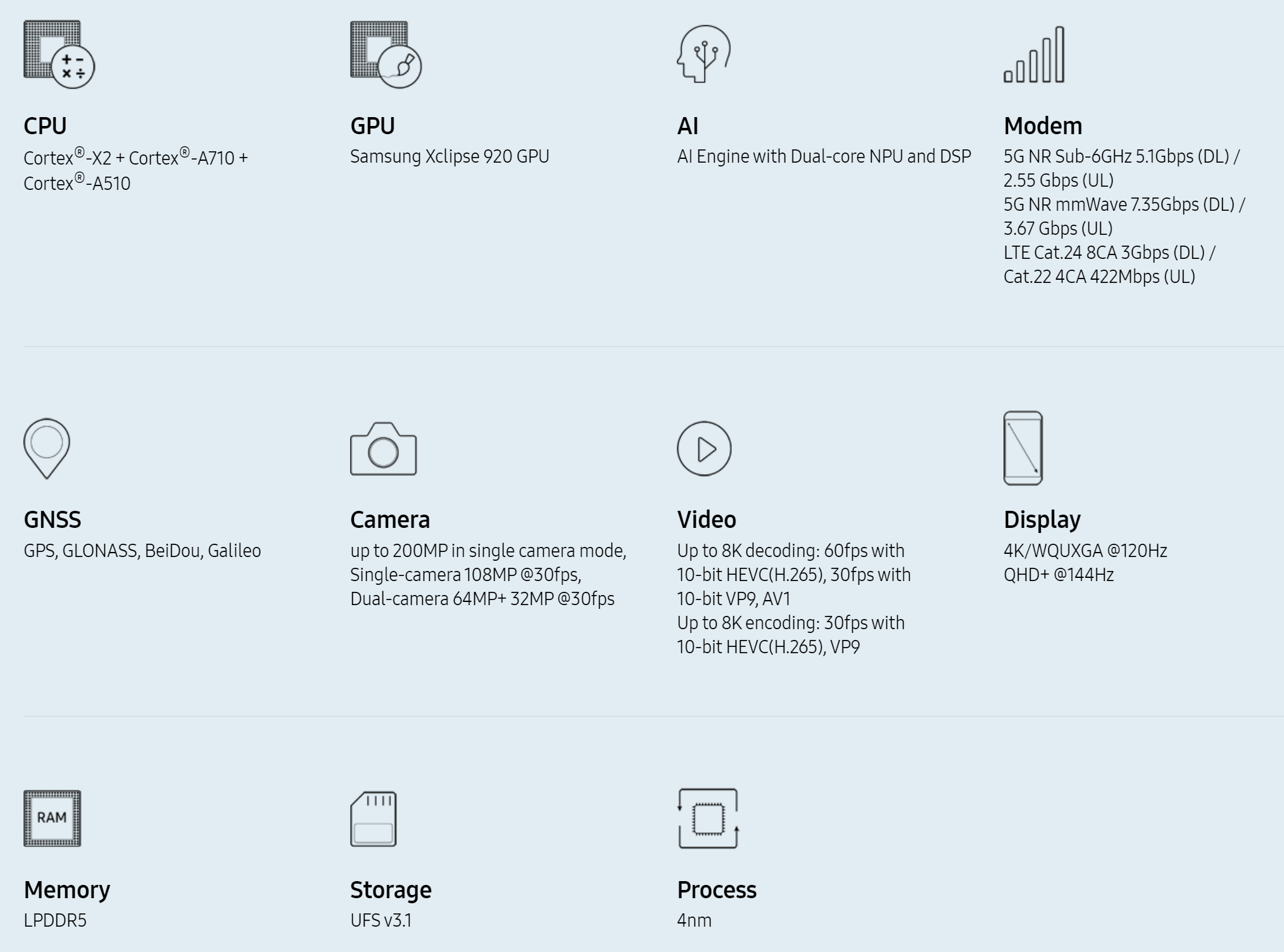 Для выпуска Samsung Exynos 2200 используется 4-нм техпроцесс с применением экстремальной ультрафиолетовой литографии (EUV). Однокристальная система в общей сложности содержит восемь ARM-ядер: одно с архитектурой Cortex-X2, три Cortex-A710 и четыре Cortex-A510. Её оснащение также включает контроллер памяти LPDDR5, нейропроцессорный модуль, высокоскоростной модем и другие блоки, типичные для современных мобильных SoC.