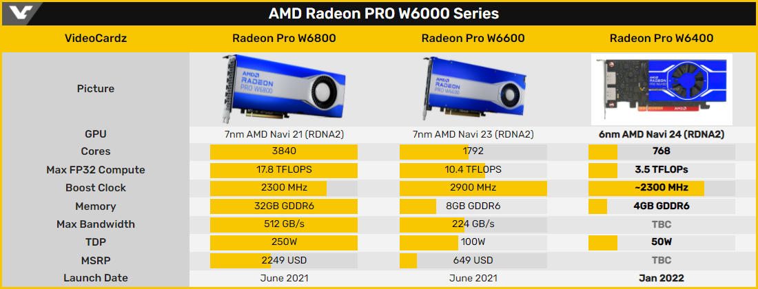 В арсенале Radeon Pro W6400 состоят 768 потоковых процессоров, 64-разрядный интерфейс памяти и буфер GDDR6 объёмом 4 ГБ. Рабочая частота GPU находится у отметки 2300 МГц, грубая вычислительная мощность видеокарты равна 3,5 Тфлопс. Более детальные спецификации новинки в ближайшее время будут опубликованы на сайте AMD.