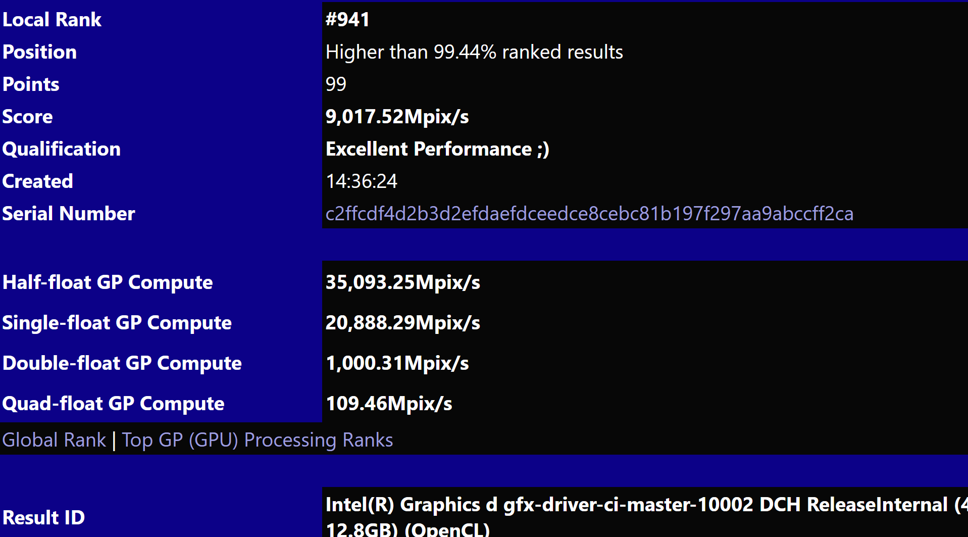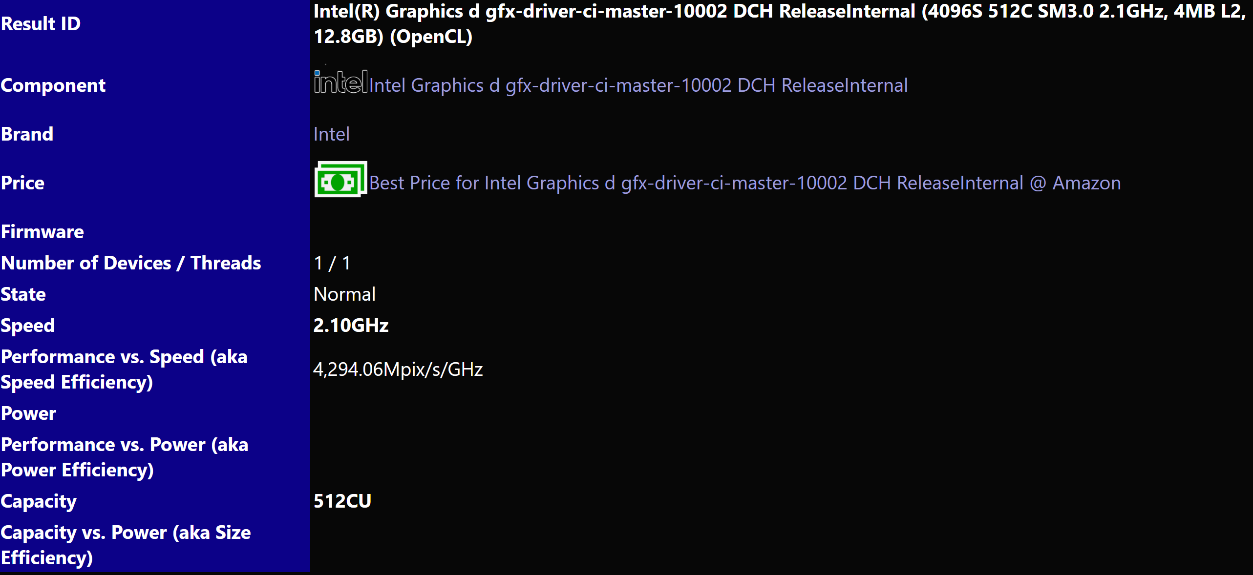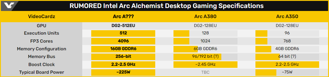 Если верить показаниям бечнмарка, в арсенале топовой видеокарты Arc Alchemist состоят 512 исполнительных блоков (Execution Units, EU) или 4096 шейдерных процессоров с частотой 2,1 ГГц и видеобуфер объёмом 12,8 Гбайт. Согласно доступной информации, в таких устройствах Intel будет использовать 256-разрядную шину вместе с 16 гигабайтами памяти GDDR6.