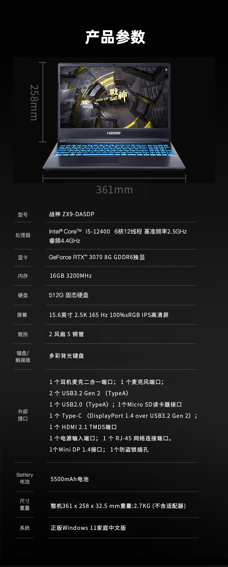 Hasee ZX9 имеет размеры 361×256×32,5 мм и вес 2,7 кг. В стандартную комплектацию также входит накопитель объёмом 512 ГБ и 15,6-дюймовая Full HD панель с частотой 165 Гц и 100% охватом палитры sRGB. По желанию покупателя ОЗУ можно расширить до 64 ГБ, а SSD заменить на более ёмкий.