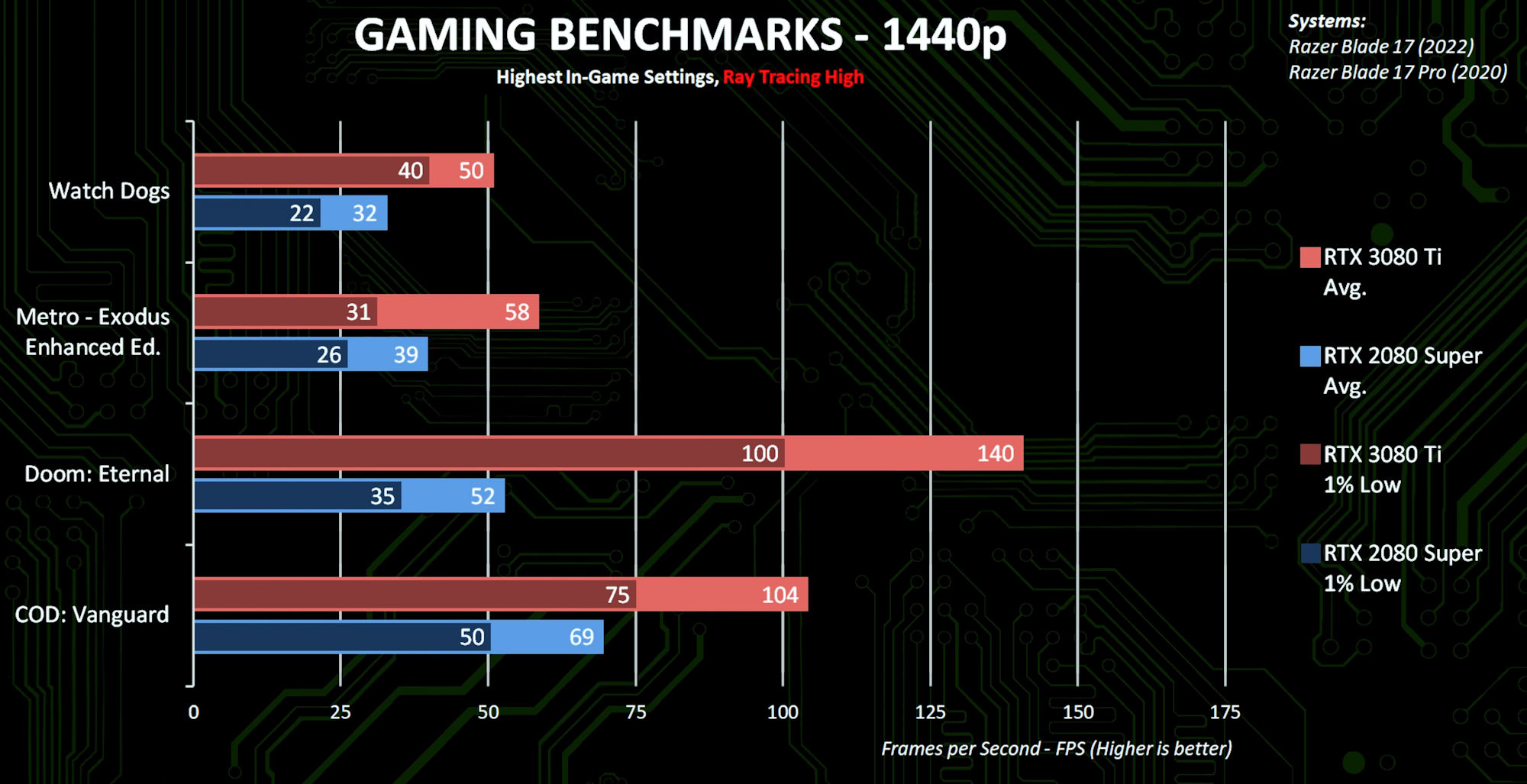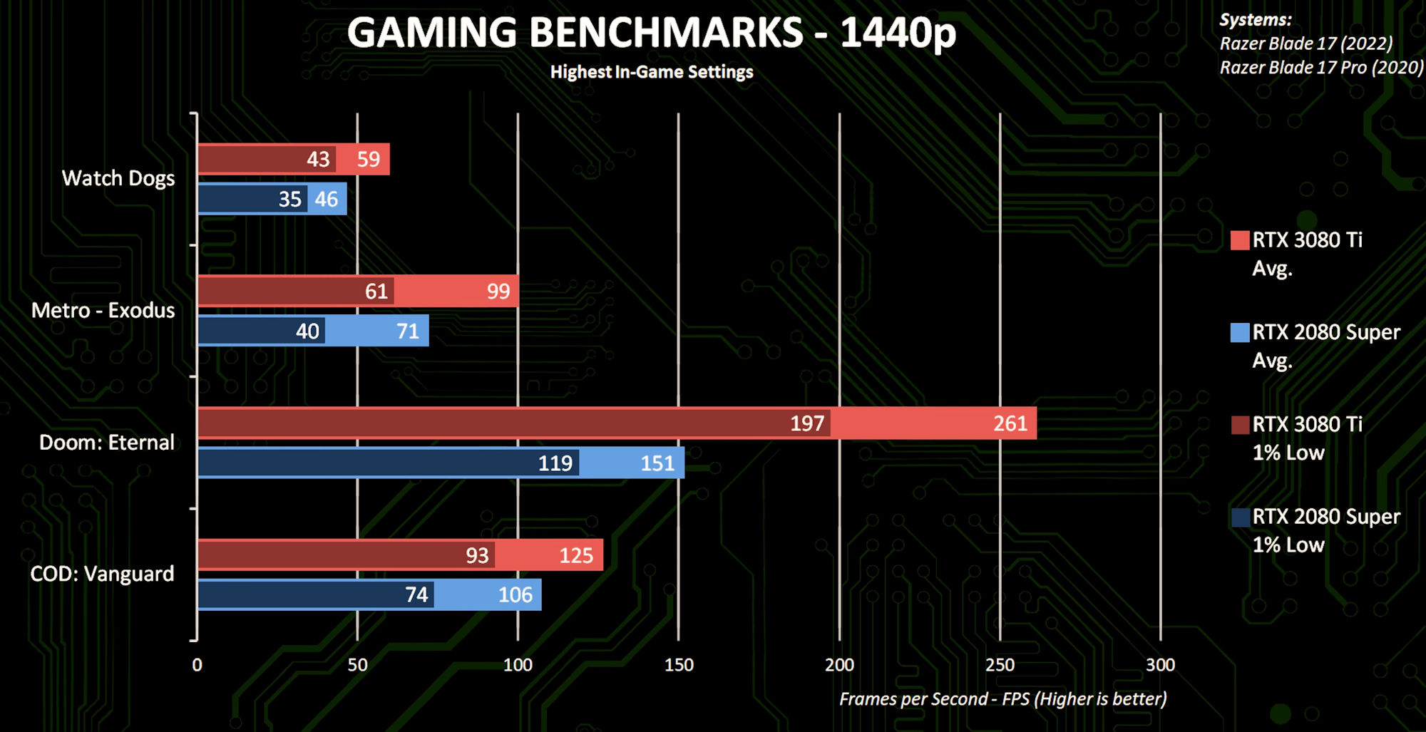 Разумеется, GeForce RTX 3080 Ti всегда опережала GeForce RTX 2080 Super. Среднее преимущество составило от 40% до 80% с пиком 169% в Doom: Eternal с Ray Tracing. Хотя интересно было бы взглянуть и на других старших представителей Ampere. Тем более в сфере ноутбуков очень многое зависит не только от CPU/GPU, но и от лимитов мощности, а также системы охлаждения.