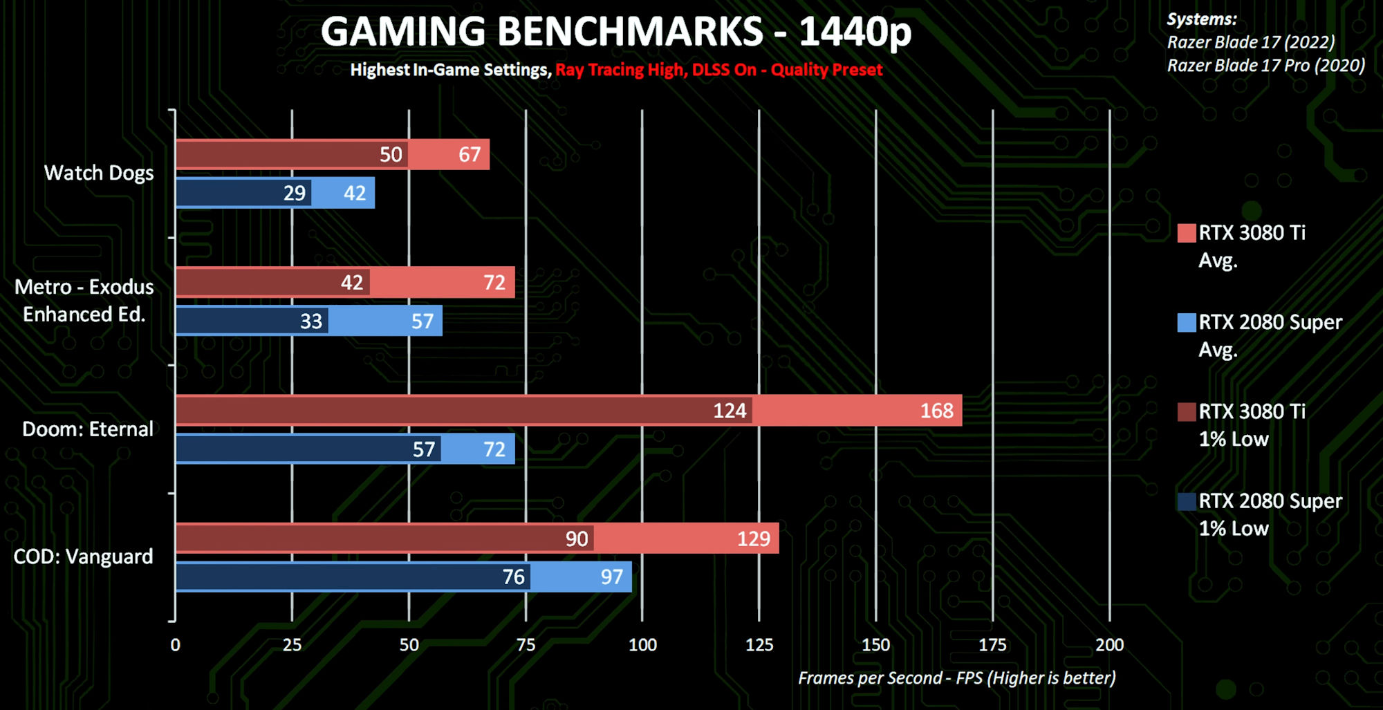 Hardware Canucks предоставил игровые тесты Watch Dogs, Metro Exodus, Doom: Eternal и COD Vanguard в разрешении 1440p. Кроме того, отдельно выделены режимы с активной трассировкой лучей и при использовании масштабирования DLSS.
