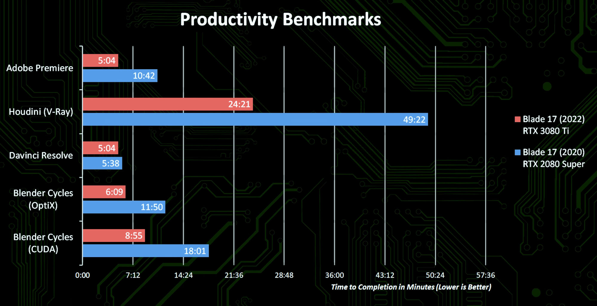 YouTube-канал Hardware Canucks опубликовал предварительный обзор ноутбука Razer Blade Pro 17 (2022) с процессором Core i7-12800H и видеокартой GeForce RTX 3080 Ti. Этот ускоритель вместе с GeForce RTX 3070 Ti был представлен на выставке CES 2022.