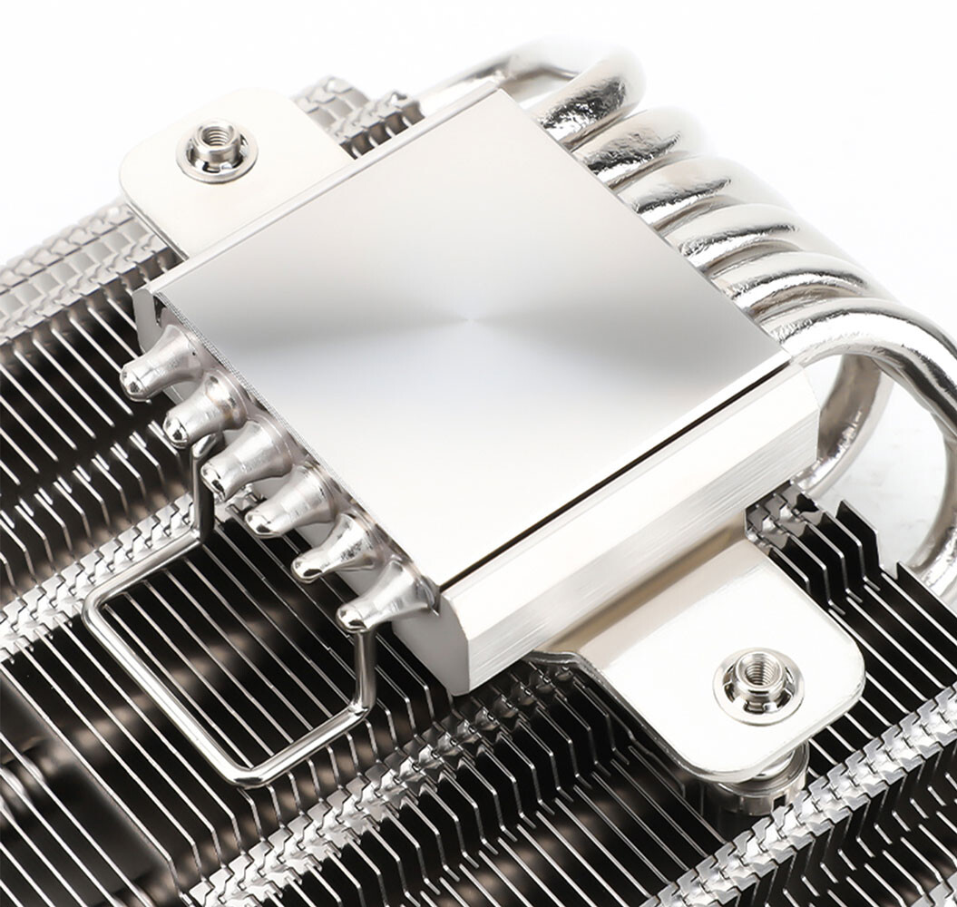 Радиатор Thermalright AXP120-X67 имеет габариты 123,5 x 120 x 52 мм. Он состоит из медного никелированного основания, шести тепловых трубок диаметром 6 мм и секции алюминиевых пластин. В перечень совместимых платформ входят Intel LGA115x, LGA1200, LGA1700 и AMD AM4.