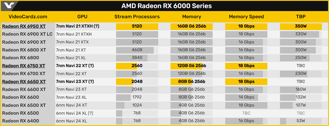 Основой вышеупомянутых 3D-ускорителей послужат графические ядра AMD Navi 21, Navi 22 и Navi 23 в максимальных конфигурациях. Главные отличия новинок от выпущенных ранее видеокарт заключается в переходе на высокоскоростные микросхемы GDDR6. Вместе с этим вырастут рабочие частоты ядер Navi 2X и штатный уровень TDP. В частности, у флагманской Radeon RX 6950 XT он составит 350 Вт.