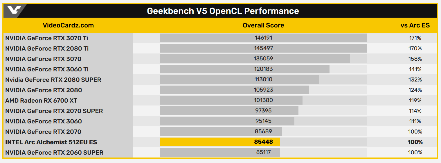 В общем тесте OpenCL видеокарта Intel Arc Alchemist набрала 85 448 баллов. На таком же уровне выступают представители Nvidia Turing, включая GeForce RTX 2070 и RTX 2060 Super. Ранее Intel говорила, что флагман Arc Alchemist замахнется на соперничество с GeForce RTX 3070.