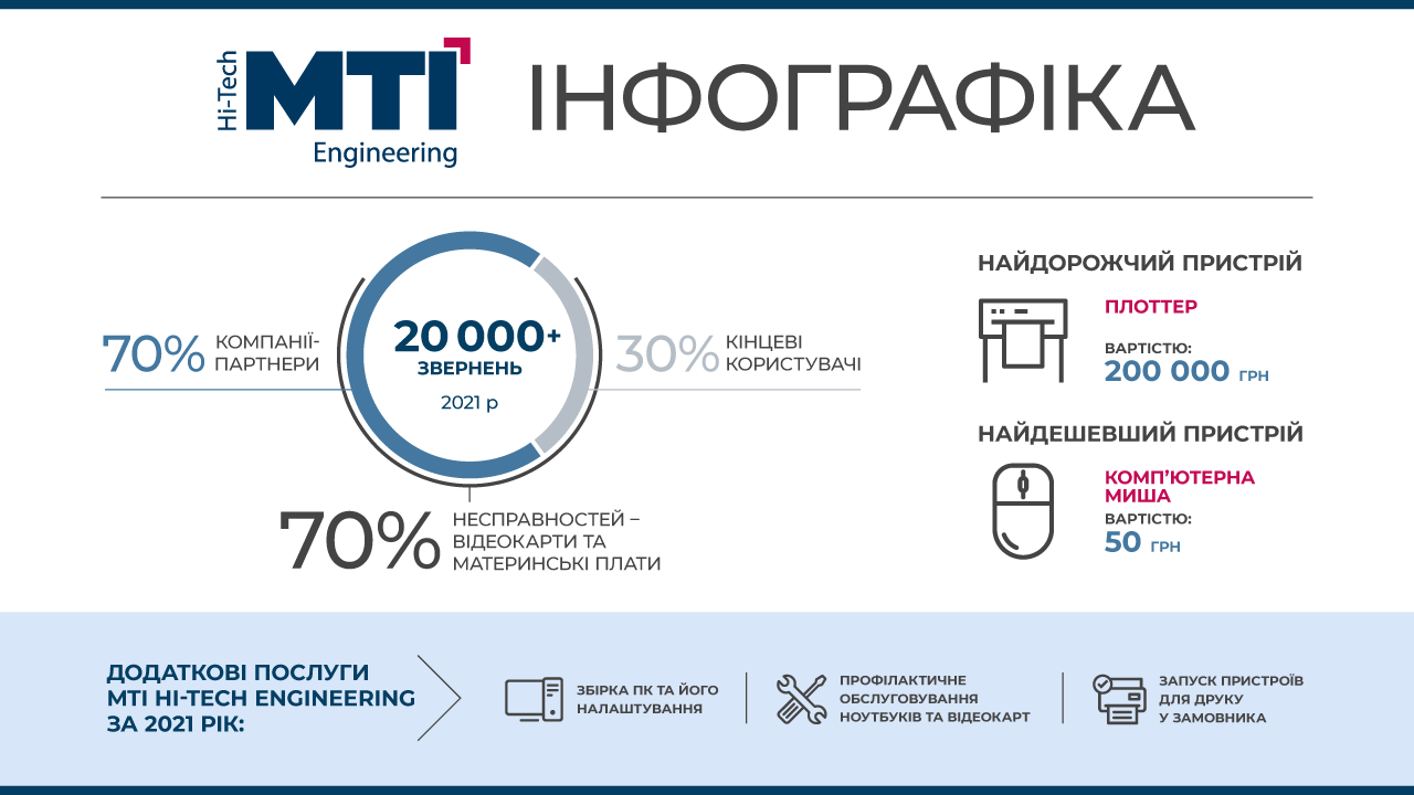 Один из крупнейших украинских дистрибьюторов IT-продукции MTI опубликовал небольшой доклад о том, какую технику украинцы чаще всего ремонтировали в 2021 году. За весь прошедший год сервисные центры обработали более 20 тысяч обращений, из которых 70% поступило от компаний-партнёров, а оставшиеся 30% — от конечных пользователей.