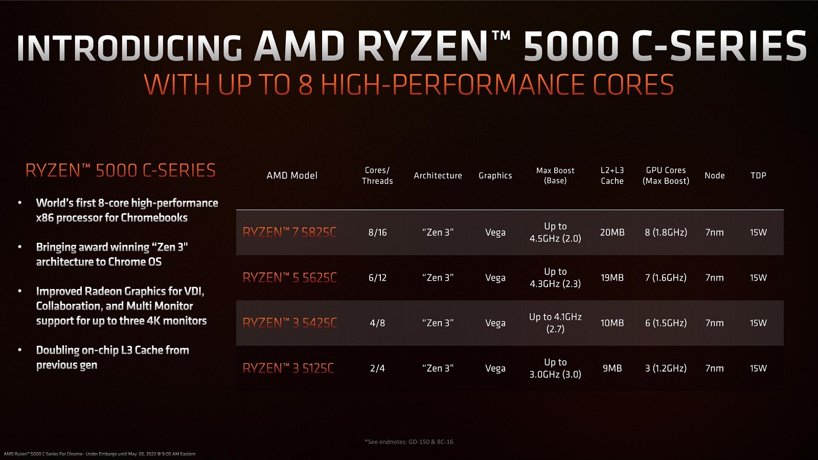 Семейство гибридных процессоров AMD Cezanne пополнилось линейкой Ryzen 5000C, рассчитанной на использование в хромбуках. Она представлена четырьмя моделями с числом ядер Zen 3 от двух до восьми штук и номинальным теплопакетом 15 Вт.