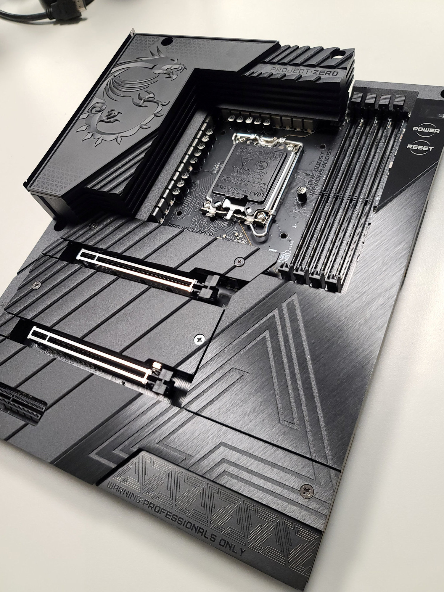 В рамках MSI Project Zero компания подготовила необычную материнскую плату LGA1700. Прообразом новинки, судя по всему, послужила модель MEG Z690 Unify. На лицевой стороне у неё распаяны слоты расширения PCI Express, процессорное гнездо, разъёмы для NVMe-накопителей и модулей оперативной памяти DDR5. Разъёмы питания, SATA и другие порты перенесены на тыльную сторону PCB.