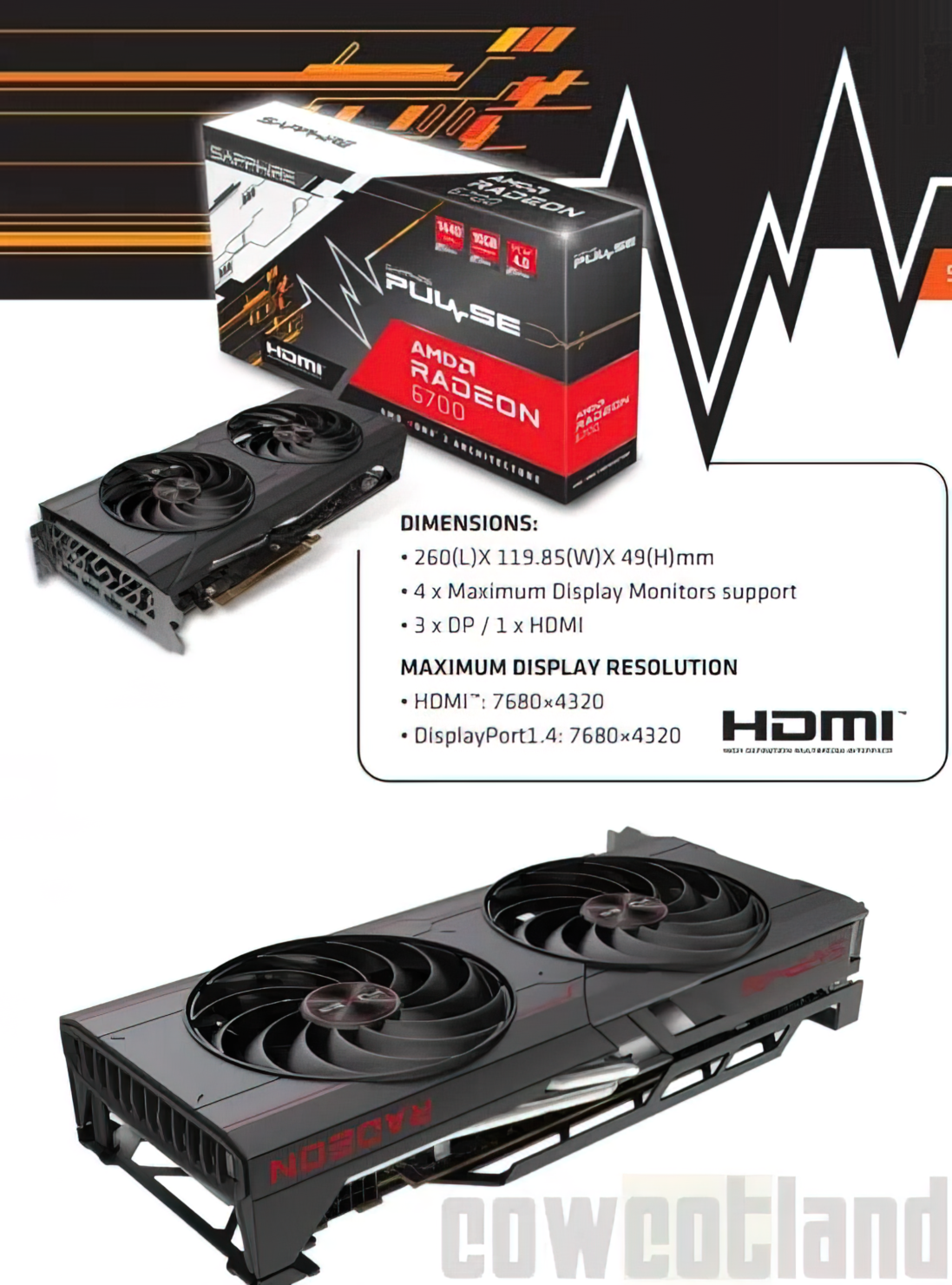 Видеобуфер набран десятью гигабайтами GDDR6 с эффективной частотой 16 ГГц, что обеспечивает пропускную способность 320 Гбайт/с. Частотная формула графического ядра имеет вид 2330/2495 МГц (Game/Boost Clock). На торце карт Radeon RX 6700 в исполнении Sapphire распаян 8-контактный разъём дополнительного питания.